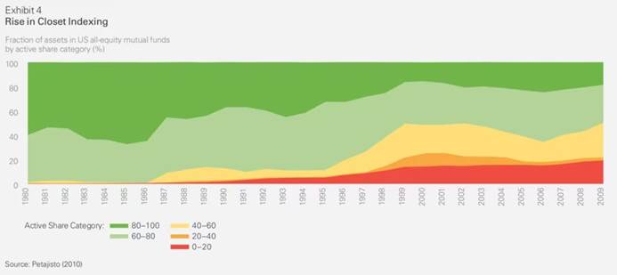 不要以为这只是少数人的举动,这个现象近些年来在欧美越来越严重。之前投资银行拉扎德就研究了从1980年到2009年美国股票型基金里面伪基金的数量变化。你从下图就能看出来,偷偷复制指数的基金经理越来越多。