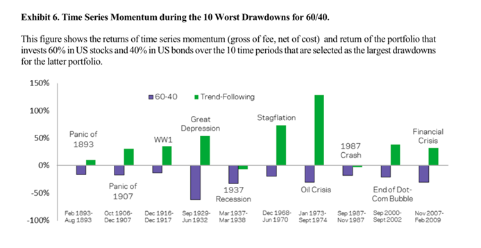 注:趋势投资为绿色,60/40股票和债券投资组合为紫色;从左至右的危机时期分别是:1893年恐慌、1907年恐慌、一战、大萧条、1937年衰退、60年代末滞胀、1987年闪崩、互联网泡沫、2008年经融危机