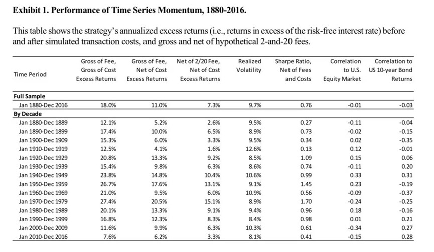 在长达137年里,每年的超额回报有18%,即使扣除成本之后也高达11%;而且不但效果好,还在不同年代、不同资产类别、不同经济周期甚至在经济危机的时候都表现非常好——从1880年开始,它在每一个10年之内都是赚钱的。并且,在历史上十次大型的金融危机和股灾里,有八次这个策略都表现非常出色,另外两次也没造成太大的亏损。