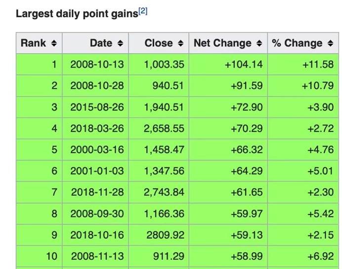 但如果我们真的穿越历史去看,你会有一个惊人的发现:2008年的美国股市很多天都是大幅上涨的——甚至,如果我们统计整个美国股票市场上百年的历史里,单日点数涨幅最高的十大交易日的话,十个里面2008年占了四个之多(截止到2018年末)——而且这个榜单里前两名都是2008年发生的。具体数字可以看下图。